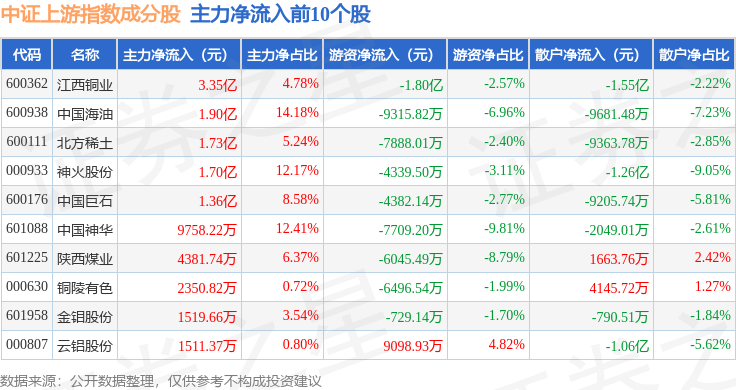 资金流向方面,中证上游(000961)指数成份股当日主力资金净流出合计26.84亿元,游资资金净流出合计1.63亿元,散户资金净流入合计28.46亿元。成份股资金流向详情见下表: