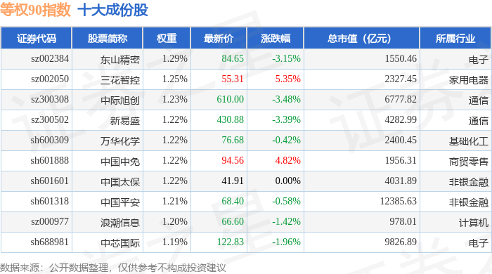 等权90(000971)指数十大成份股详情如下:
