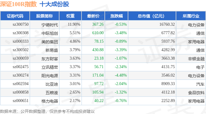 资金流向方面,深证100R(399004)指数成份股当日主力资金净流出合计119.6亿元,游资资金净流入合计46.39亿元,散户资金净流入合计73.21亿元。成份股资金流向详情见下表: