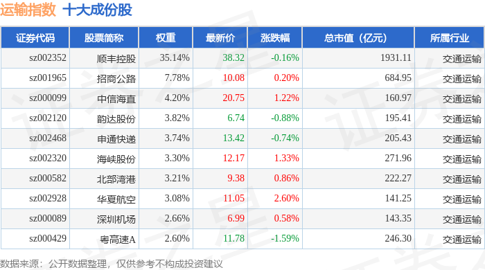 证券之星消息,12月31日,运输指数(399237)报收于1105.46点,涨0.01%,成交68.48亿元,换手率1.34%。当日该指数成份股中,上涨的有20家,恒基达鑫以7.37%的涨幅领涨,下跌的有13家,龙洲股份以9.98%的跌幅领跌。