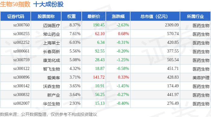 证券之星消息,12月31日,生物50(399280)指数报收于2044.04点,跌0.4%,成交104.77亿元,换手率1.11%。当日该指数成份股中,上涨的有15家,东诚药业以2.84%的涨幅领涨,下跌的有32家,迈瑞医疗以2.63%的跌幅领跌。