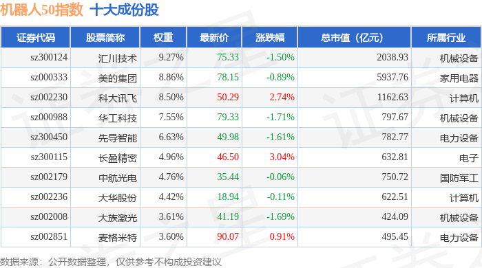 机器人50(399283)指数十大成份股详情如下: