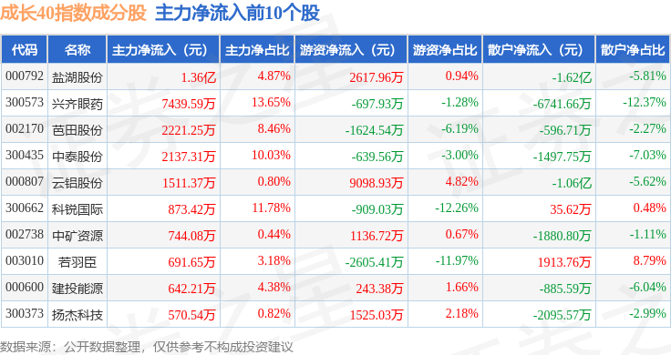 资金流向方面,成长40(399326)指数成份股当日主力资金净流出合计51.5亿元,游资资金净流入合计20.5亿元,散户资金净流入合计31.0亿元。成份股资金流向详情见下表: