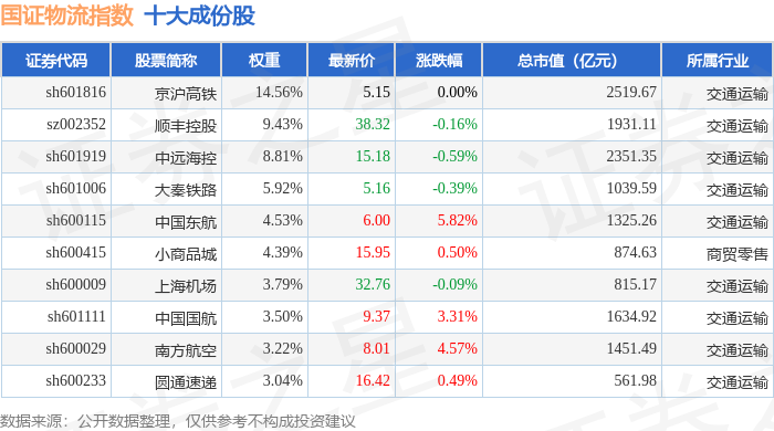 证券之星消息,12月31日,国证物流(399353)指数报收于2156.33点,涨0.63%,成交152.06亿元,换手率0.74%。当日该指数成份股中,上涨的有20家,吉祥航空以7.2%的涨幅领涨,下跌的有17家,永辉超市以4.67%的跌幅领跌。