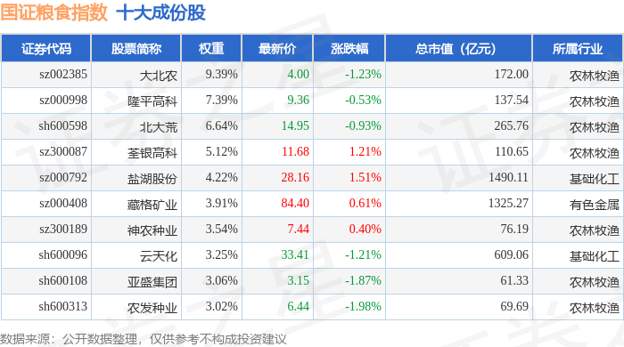 国证粮食(399365)指数十大成份股详情如下: