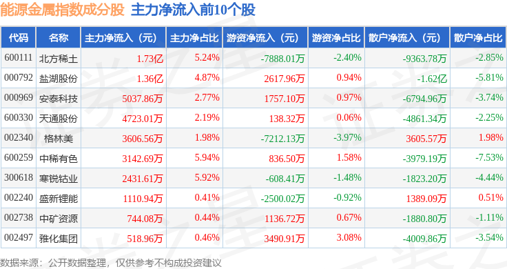 资金流向方面,能源金属(399366)指数成份股当日主力资金净流出合计15.41亿元,游资资金净流入合计1.55亿元,散户资金净流入合计13.82亿元。成份股资金流向详情见下表: