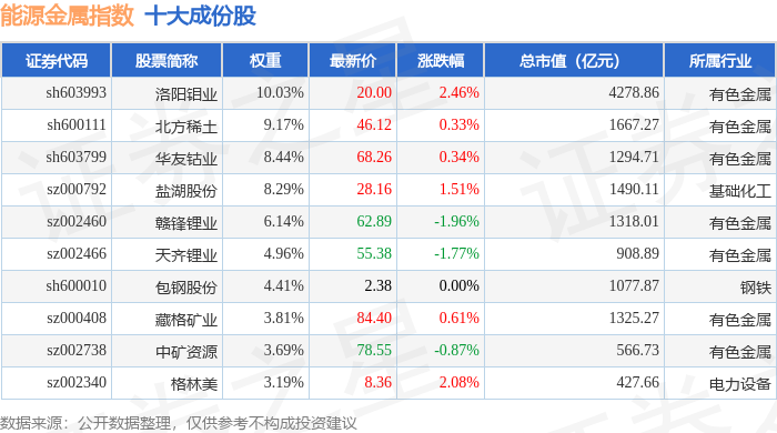 能源金属(399366)指数十大成份股详情如下:
