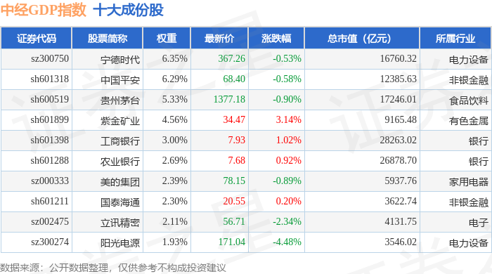 中经GDP(399399)指数十大成份股详情如下: