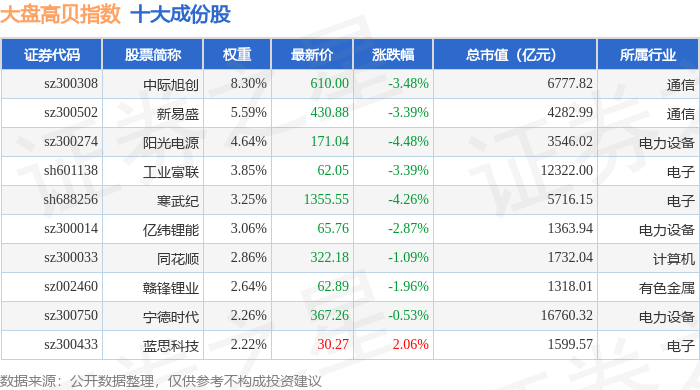 大盘高贝(399405)指数十大成份股详情如下: