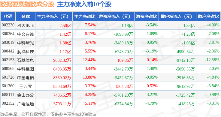 资金流向方面,数据要素(399418)指数成份股当日主力资金净流出合计2.73亿元,游资资金净流出合计1.63亿元,散户资金净流入合计4.36亿元。成份股资金流向详情见下表: