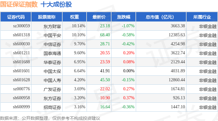 证券之星消息,12月31日,国证保证(399420)指数报收于1577.21点,跌0.37%,成交254.7亿元,换手率0.57%。当日该指数成份股中,上涨的有5家,东方证券以0.37%的涨幅领涨,下跌的有24家,兴业证券以1.46%的跌幅领跌。
