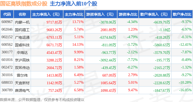 资金流向方面,国证高铁(399419)指数成份股当日主力资金净流出合计6.01亿元,游资资金净流入合计1.11亿元,散户资金净流入合计4.86亿元。成份股资金流向详情见下表: