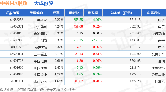 中关村A(399422)指数十大成份股详情如下: