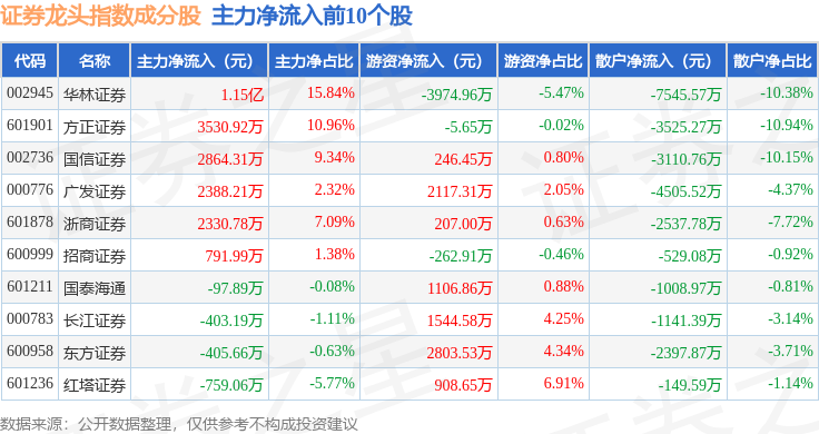 资金流向方面,证券龙头(399437)指数成份股当日主力资金净流出合计11.17亿元,游资资金净流入合计6.38亿元,散户资金净流入合计4.79亿元。成份股资金流向详情见下表: