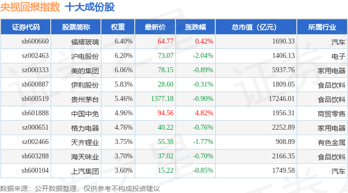 央视回报(399553)指数十大成份股详情如下: