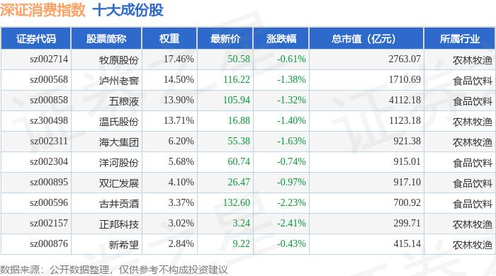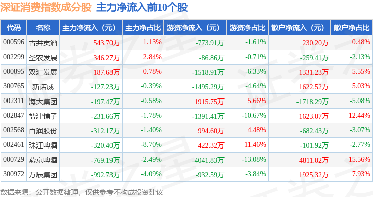 资金流向方面,深证消费(399617)指数成份股当日主力资金净流出合计10.43亿元,游资资金净流入合计2.48亿元,散户资金净流入合计7.95亿元。成份股资金流向详情见下表:
