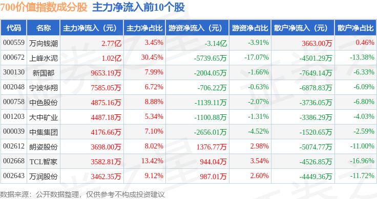 资金流向方面,700价值(399629)指数成份股当日主力资金净流出合计12.08亿元,游资资金净流入合计2265.99万元,散户资金净流入合计11.85亿元。成份股资金流向详情见下表: