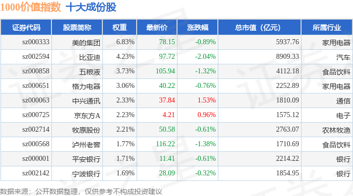 1000价值(399631)指数十大成份股详情如下: