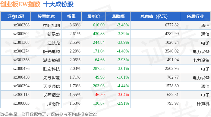 证券之星消息,12月31日,创业板EW(399635)指数报收于2171.94点,跌0.12%,成交1836.59亿元,换手率3.0%。当日该指数成份股中,上涨的有32家,蓝色光标以20.0%的涨幅领涨,下跌的有67家,北京君正以5.65%的跌幅领跌。