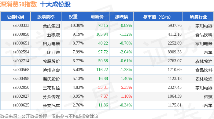 深消费50(399646)指数十大成份股详情如下: