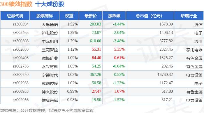 300绩效(399657)指数十大成份股详情如下: