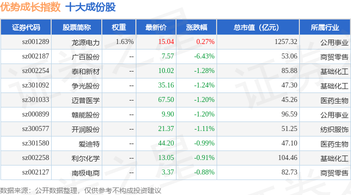 证券之星消息,12月31日,优势成长(399698)指数报收于52129.66点,涨0.14%,成交62.73亿元,换手率2.11%。当日该指数成份股中,上涨的有25家,润贝航科以5.31%的涨幅领涨,下跌的有23家,广百股份以6.43%的跌幅领跌。