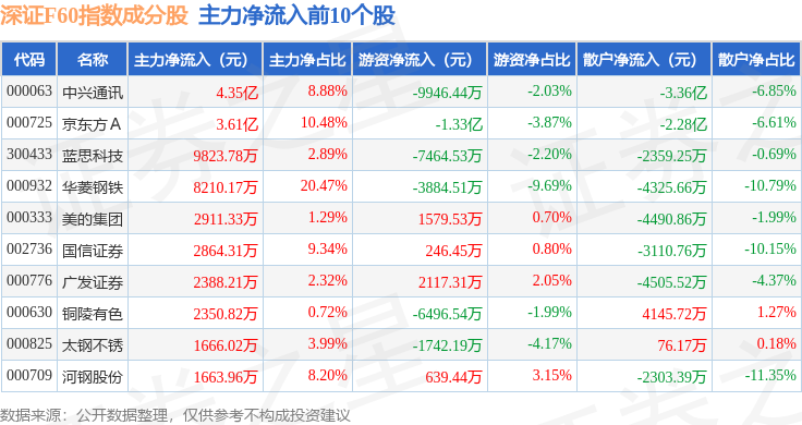 资金流向方面,深证F60(399701)指数成份股当日主力资金净流出合计36.76亿元,游资资金净流入合计9.84亿元,散户资金净流入合计26.92亿元。成份股资金流向详情见下表: