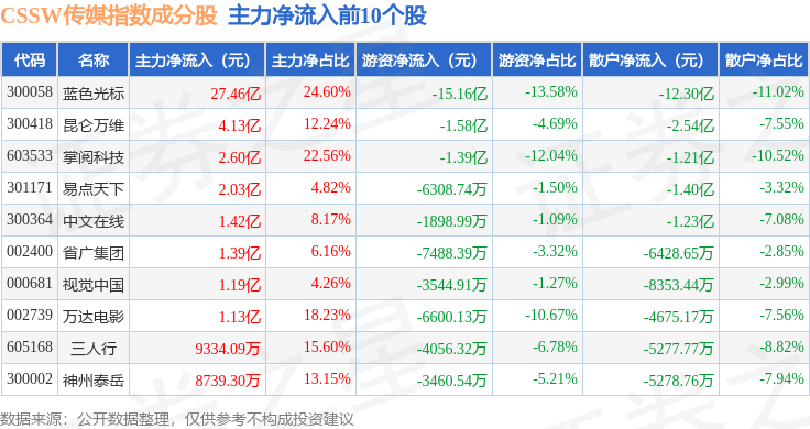 资金流向方面,CSSW传媒(399810)指数成份股当日主力资金净流入合计46.99亿元,游资资金净流出合计21.89亿元,散户资金净流出合计25.09亿元。成份股资金流向详情见下表: