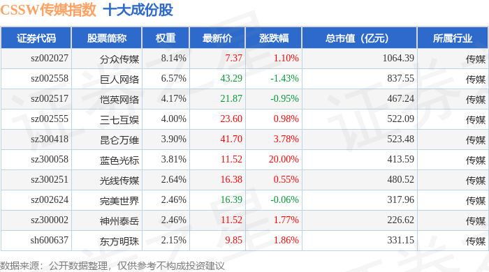 证券之星消息,12月31日,CSSW传媒(399810)指数报收于3084.0点,涨1.99%,成交582.94亿元,换手率4.04%。当日该指数成份股中,上涨的有80家,蓝色光标以20.0%的涨幅领涨,下跌的有15家,百纳千成以3.48%的跌幅领跌。