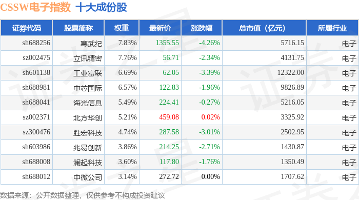 证券之星消息,12月31日,CSSW电子(399811)指数报收于5694.57点,跌1.54%,成交1179.24亿元,换手率1.89%。当日该指数成份股中,上涨的有15家,联创光电以9.99%的涨幅领涨,下跌的有42家,北京君正以5.65%的跌幅领跌。