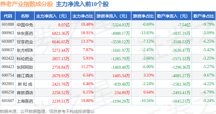 资金流向方面,养老产业(399812)指数成份股当日主力资金净流出合计6.79亿元,游资资金净流入合计3169.1万元,散户资金净流入合计6.47亿元。成份股资金流向详情见下表:
