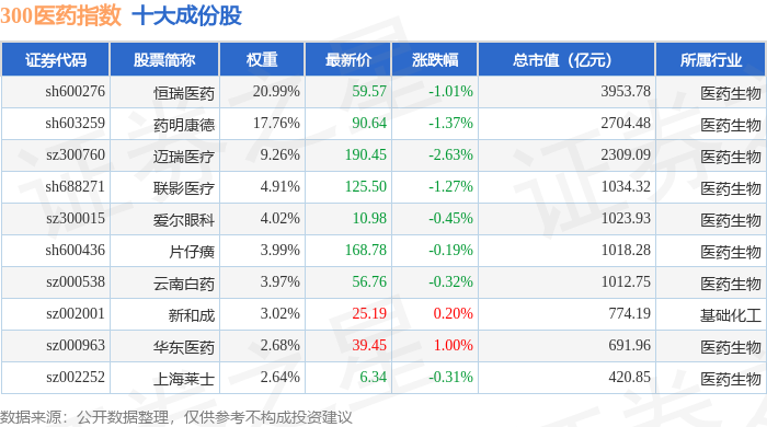 300医药(399913)指数十大成份股详情如下: