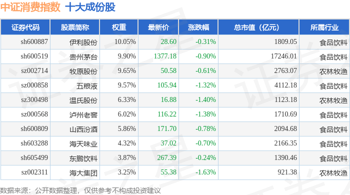 中证消费(399932)指数十大成份股详情如下: