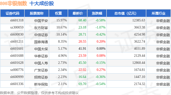 证券之星消息,12月31日,800非银(399966)指数报收于6612.89点,跌0.46%,成交320.55亿元,换手率0.65%。当日该指数成份股中,上涨的有7家,华林证券以2.68%的涨幅领涨,下跌的有40家,中银证券以1.7%的跌幅领跌。