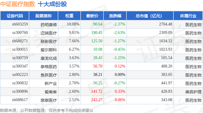 证券之星消息,12月31日,中证医疗(399989)指数报收于6760.06点,跌0.68%,成交161.05亿元,换手率1.53%。当日该指数成份股中,上涨的有13家,卫宁健康以2.2%的涨幅领涨,下跌的有36家,美好医疗以3.8%的跌幅领跌。