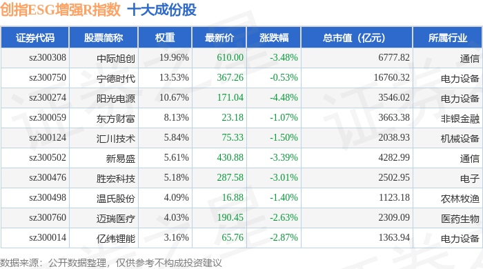 创指ESG增强R(470034)指数十大成份股详情如下: