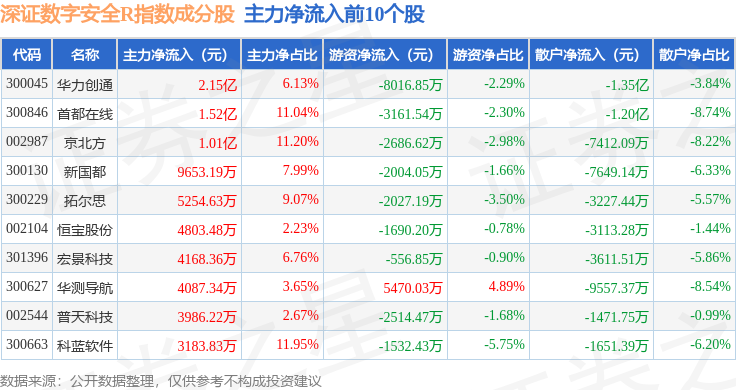 资金流向方面,深证数字安全R(470052)指数成份股当日主力资金净流入合计1.0亿元,游资资金净流出合计7759.17万元,散户资金净流出合计2268.72万元。成份股资金流向详情见下表: