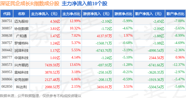 资金流向方面,深证民企成长R(470071)指数成份股当日主力资金净流出合计70.84亿元,游资资金净流入合计31.79亿元,散户资金净流入合计39.05亿元。成份股资金流向详情见下表: