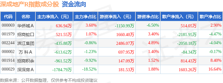 资金流向方面,深成地产R(471001)指数成份股当日主力资金净流出合计2637.33万元,游资资金净流入合计4022.05万元,散户资金净流出合计1384.72万元。成份股资金流向详情见下表: