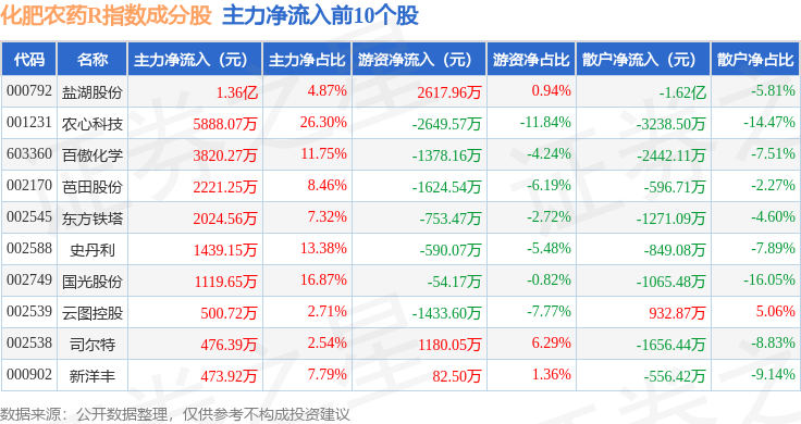 资金流向方面,化肥农药R(480035)指数成份股当日主力资金净流出合计1.82亿元,游资资金净流入合计4584.97万元,散户资金净流入合计1.34亿元。成份股资金流向详情见下表: