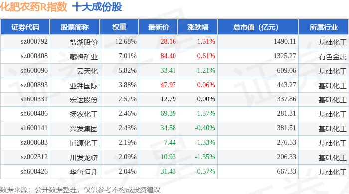 证券之星消息,12月31日,化肥农药R(480035)指数报收于2772.28点,跌0.3%,成交143.47亿元,换手率1.41%。当日该指数成份股中,上涨的有18家,农心科技以10.01%的涨幅领涨,下跌的有43家,司尔特以5.03%的跌幅领跌。