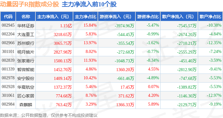 资金流向方面,动量因子R(480057)指数成份股当日主力资金净流出合计11.43亿元,游资资金净流入合计4.93亿元,散户资金净流入合计6.51亿元。成份股资金流向详情见下表: