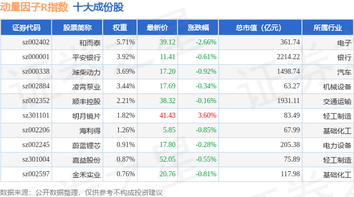 证券之星消息,12月31日,动量因子R(480057)指数报收于2899.95点,跌0.22%,成交190.71亿元,换手率1.15%。当日该指数成份股中,上涨的有16家,明月镜片以3.6%的涨幅领涨,下跌的有34家,长盛轴承以3.91%的跌幅领跌。