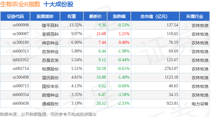 生物农业R(480072)指数十大成份股详情如下:
