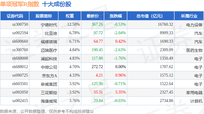 单项冠军R(480150)指数十大成份股详情如下: