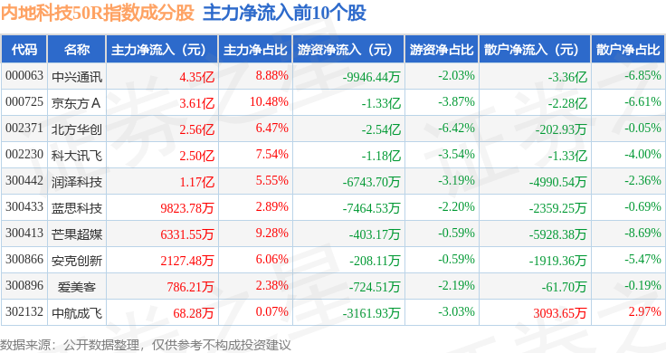 资金流向方面,内地科技50R(483003)指数成份股当日主力资金净流出合计28.33亿元,游资资金净流入合计7.15亿元,散户资金净流入合计21.18亿元。成份股资金流向详情见下表: