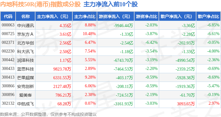 资金流向方面,内地科技50R(港币)(483004)指数成份股当日主力资金净流出合计28.33亿元,游资资金净流入合计7.15亿元,散户资金净流入合计21.18亿元。成份股资金流向详情见下表: