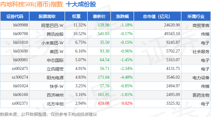 内地科技50R(港币)(483004)指数十大成份股详情如下: