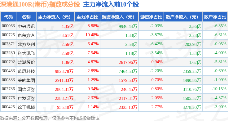 资金流向方面,深港通100R(港币)(483008)指数成份股当日主力资金净流出合计81.27亿元,游资资金净流入合计37.28亿元,散户资金净流入合计43.99亿元。成份股资金流向详情见下表: