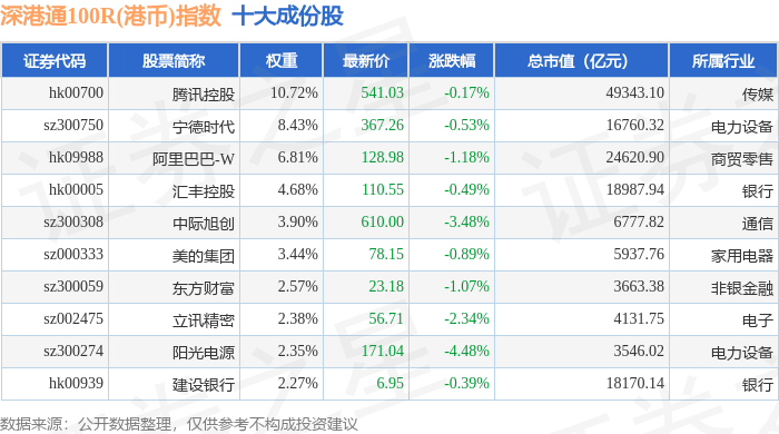 深港通100R(港币)(483008)指数十大成份股详情如下: